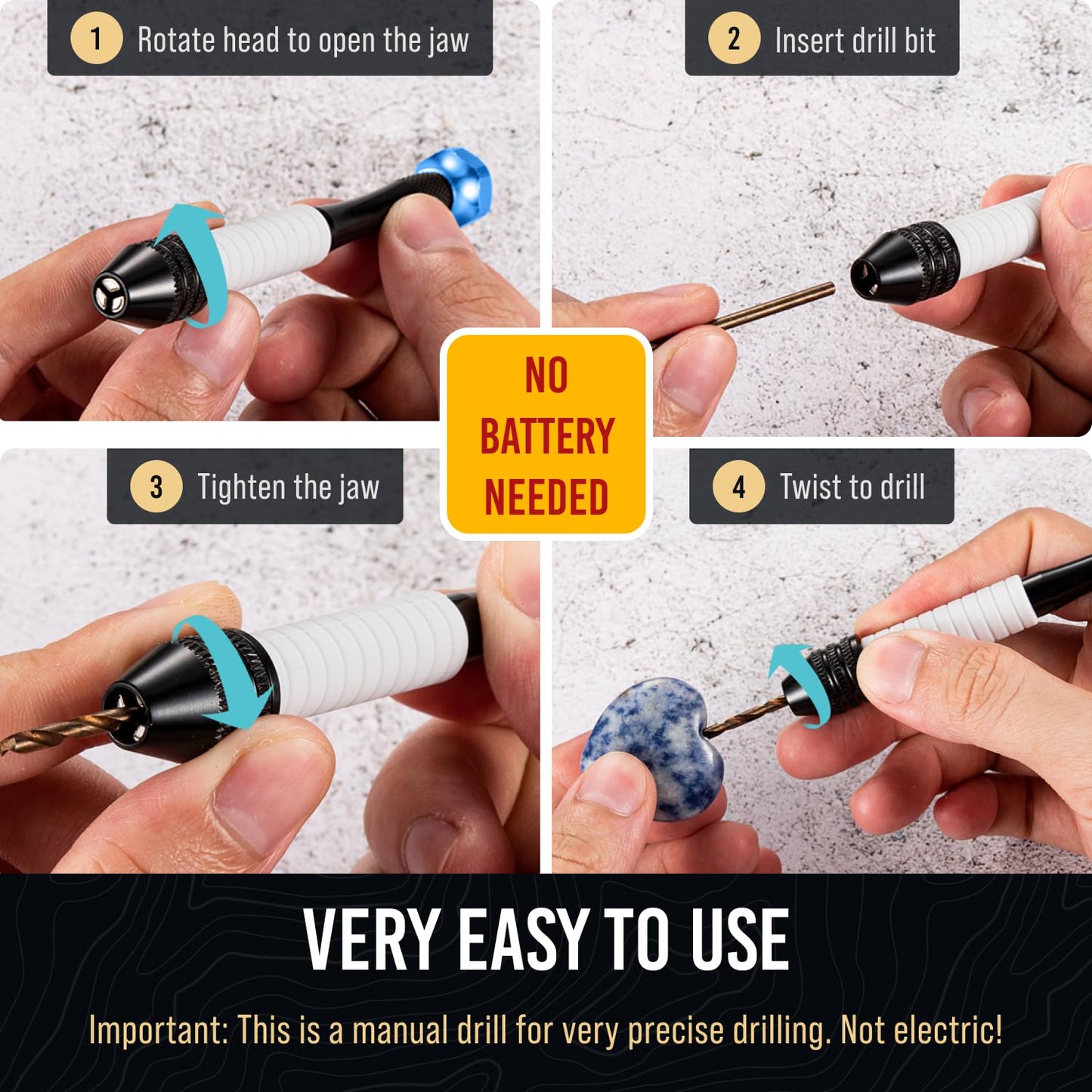 - NO BATTERY, MANUAL DRILL - This pin vise hand drill offers an eco-friendly alternative to electric drills. Whether you're in a workshop, at home, or out in nature, this hand push drill is always ready to work. Its hands-on operation gives you ultimate control over your crafting and hobby projects, ensuring precise results every time.